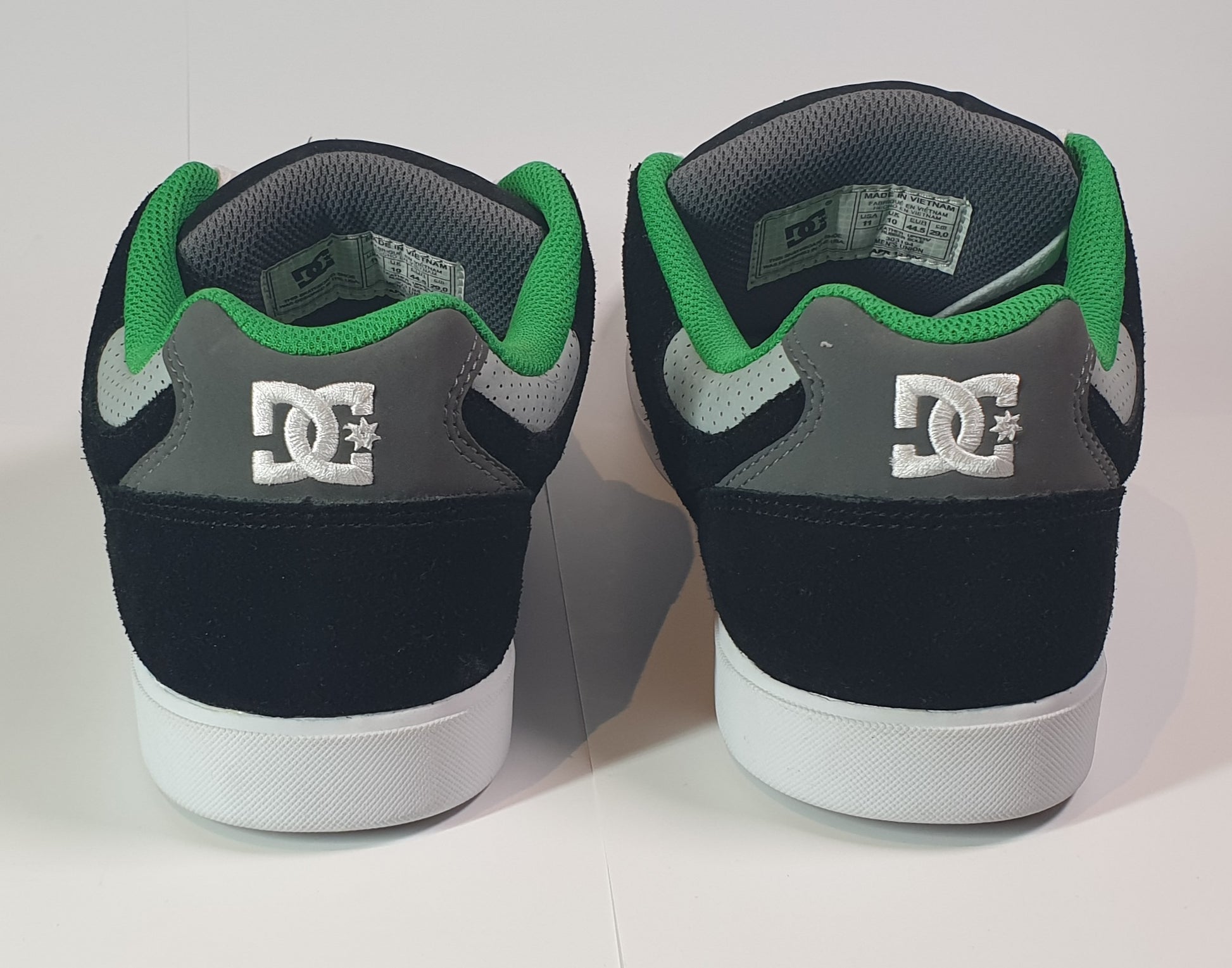 Up your skate game with the DC Command skate shoes! The black and grey upper, white sole, and bright green lining offer a stylish touch to your everyday look. Made with durable materials like synthetic leather and canvas, these shoes provide long-lasting resistance and easy cleaning. Perfect for both skateboarding and casual wear.