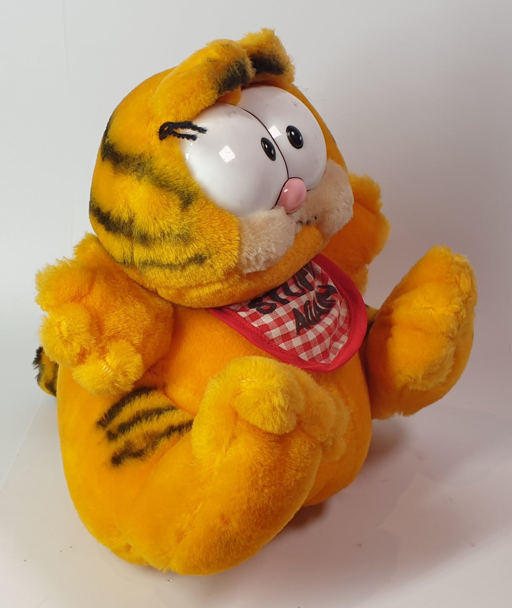 Bring home the lasagna-loving feline that's captured hearts for decades! This adorable Garfield plush toy features the iconic orange tabby cat complete with his signature checkered bib, making it instantly recognisable to fans of all ages. Soft and cuddly, this plush is perfect for collectors, children, or anyone who appreciates the humorous charm of the world's most famous cartoon cat. Whether displayed on a shelf or snuggled during quiet moments, this Garfield companion delivers comfort and nostalgia in one delightful package.