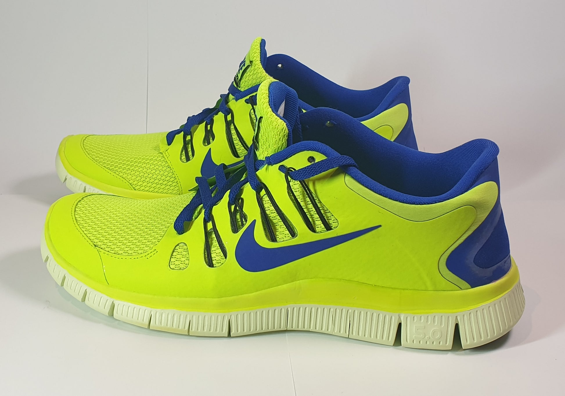 Nike Free 5.0+ running shoes in a volt (neon yellow/green) and blue