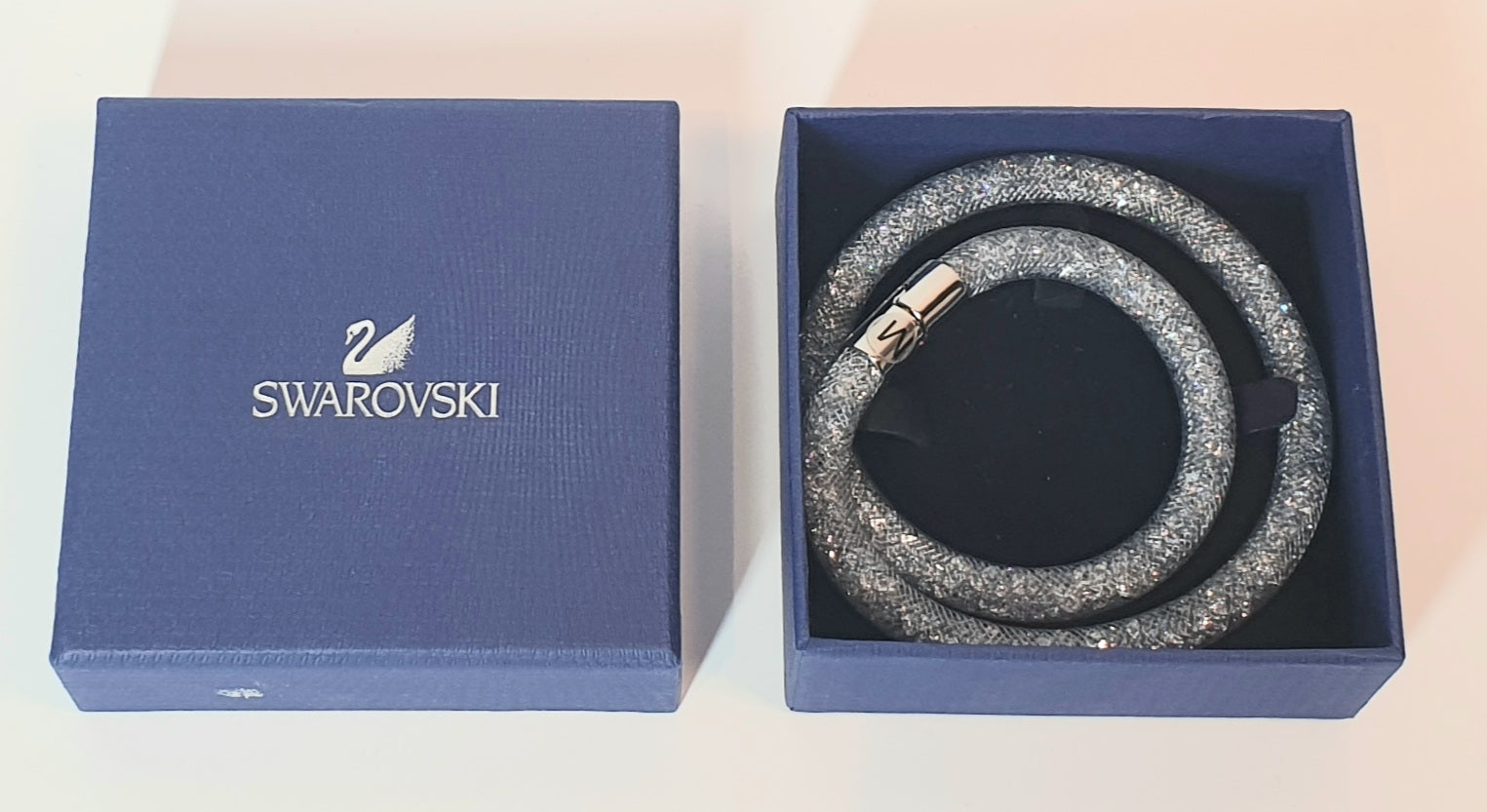Feel what it is like to have the magic of versatile elegance with this stunning Swarovski Stardust piece. Crafted from a luxurious nylon mesh tube brimming with hundreds of brilliant Swarovski crystals, it transforms effortlessly from a sophisticated double-wrap bracelet to an eye-catching choker. The silver-toned magnetic closure ensures secure, hassle-free styling, while the radiant clear crystals catch light beautifully from every angle. Perfect for elevating both casual and formal looks, this multi-functional accessory adapts to your mood and occasion. Arrives in Swarovski's iconic deep blue gift box, making it an ideal gift for yourself or someone special.